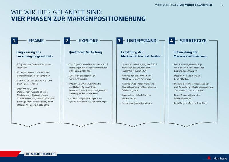Auf Basis der Erkenntnisse unserer Untersuchung und der strategischen Ableitungen haben wir ein Markenhandbuch als Leitfaden für alle erstellt, die für und mit der Marke Hamburg arbeiten. Es bietet Einblicke in die Zielgruppen und relevante Themen, mit welchen wir diese ansprechen, und definiert die Leitplanken unter anderem für folgende Bereiche der Marke neu:
