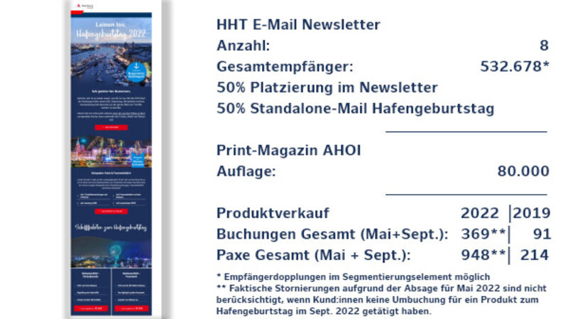 Als Ende Januar 2022 die Nachricht der offiziellen Absage des Hafengeburtstags aufgrund der noch andauernden Pandemie im Mai uns erreichte, haben wir in kürzester Zeit umdisponieren müssen. Die vertriebliche HHT-Kommunikation des Hafengeburtstags an unsere Kund:innen beginnt stets im Oktober mit diversen Newsletterkampagnen, einer kundenzentrierten Landingpage sowie weitere interne Platzierungen auf unserer Website. Mit den Vertriebsmaßnahmen werden explizit nur für das besondere Großevent sowohl Tagesgäste als auch Übernachtungsgäste personalisiert aufmerksam gemacht. Verkaufsprodukte wie die extra eingekaufte Pauschale zum Hafengeburtstag als auch die Schiffstörns mit den Einlauf-, Auslauf- und Feuerwerksfahrten sind Teile unserer Produktkommunikation in diversen Medien. Aufgrund der Absage des Termins im Mai folgte ein aufwendiger Abwicklungsprozess, bei dem wir viele Kunden letztendlich für den verschobenen Hafengeburtstag im Spätsommer gewinnen und umbuchen konnten.